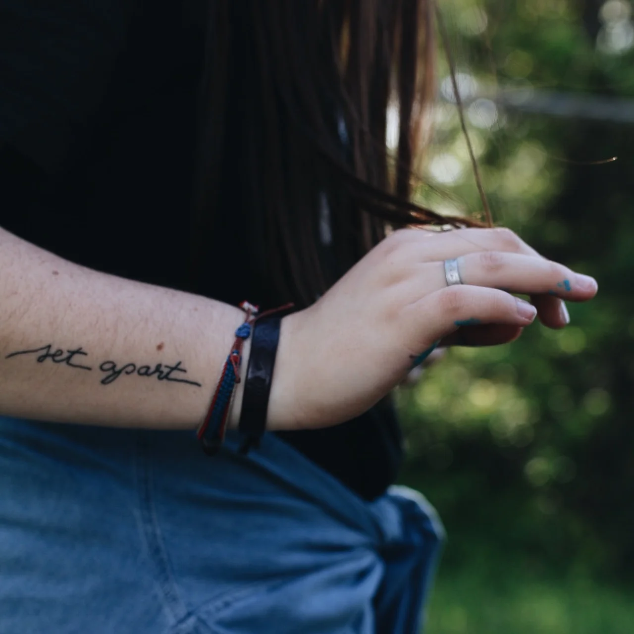 Okay so now that you know the setting and where I got it, let me explain the meaning because it holds a lot in my heart. I got the words "set apart" in my mothers handwriting on my right forearm. In Leviticus 20:26 it states, "You are to be holy, for I, The Lord, am holy. I have set you apart from the nations to be my very own." Growing up, I always felt different from the world, almost like I didn't really fit in. I knew there was something in me unusual from the rest. One week at church camp, I expressed the way I was feeling. Someone spoke over me, declaring the I was set apart from the world, and that it was okay that I didn't fit in to the norm...God had made me this way. Ever since then, the words set apart appeared in my life everywhere. Other people would tell me the same thing, I would hear it in church often or read it in my Bible. I had been declared set apart. It didn't always mean that I liked being this "set apart girl" because I thought it meant that I was the odd ball (or weird one). But then I had a realization that God had truly called me to be different-not like the world. He calls all of us who believe in Him to stand out. It is okay to be different, in fact He tells us to. We are called to be IN the world, but not OF the world. That is what it meant for me to be set apart. I spoke those words over my life and accepted the challenge.